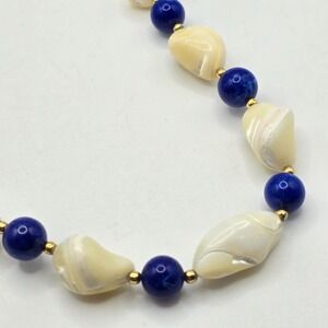 Cobalt Blue and Cream Beaded Necklace Gold Tone Spacers Jewelry