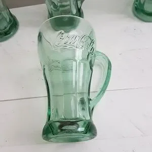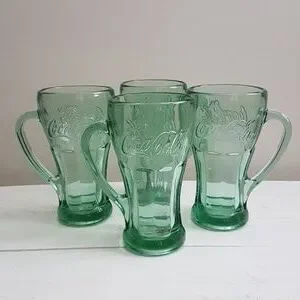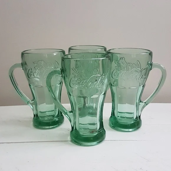 Coca Cola Set Of 4 Glass Mugs In Green Glass, Double Sided Coca Cola. 14 oz.