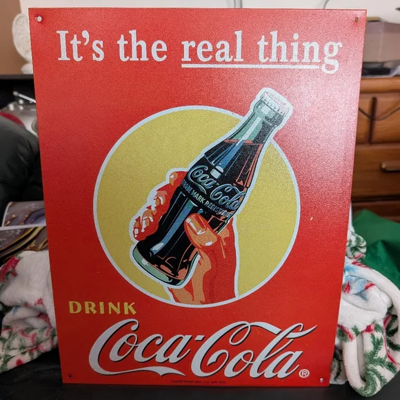 Metal Coca-Cola sign. Like new. Holes in each corner, for easy mounting. Slogan: It's the real thing, always Coca-Cola
