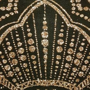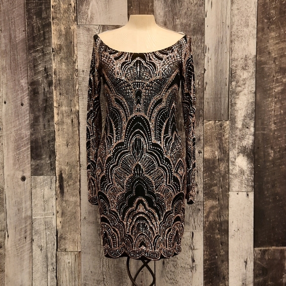 Beautiful Flattering Architectural Appliqué (I'm feeling Empire State Building) in Rose Gold Glitter, Wide Shoulder Cocktail Dress.