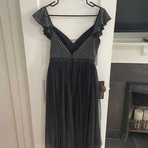 Fun and flirty black cocktail dress with beaded bodice, tulle skirt and capped sleeves. Only worn once
