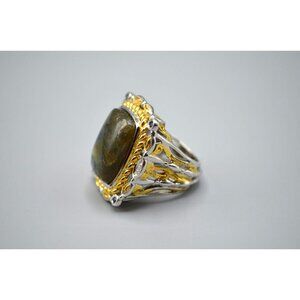 A vermeil cocktail ring featuring a green/brown stone that appears to be moss agate. It's stamped "925 NH". It weighs 14.16g and is a size 7. In excellent condition, please review photos closely.