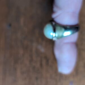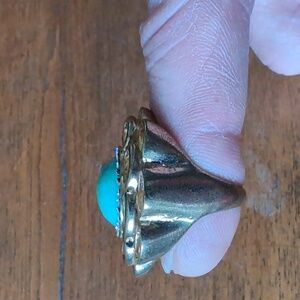 Two cocktail rings. One is plain with a large white pearl- like stone. The more ornate ring has a ring of fake diamonds around an oval Robin's egg blue mottled stone. Small size (4ish) and not adjustable.