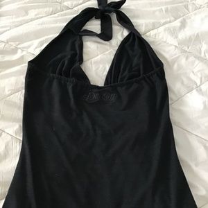 Black halter cocktail dress designed by House of Dereon (Tina Knowles)