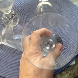 Cocktails anyone? 4 Bubble Martini glasses round ball stem, clear v bowl- used Gorgeously controlled bubbles in the base gives these martini glasses a simplistic but sophisticated look. Add a bubbly cocktail and you have a delicious concoction. Can be used for sherbert, dessert, shrimp cocktail and more.
