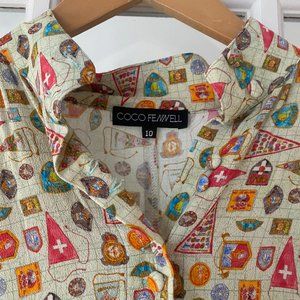 Beautiful, unique dress that is SO much fun to wear. Made from a heavy viscose crepe in a scout flag print on pale pistachio green background. Bishop sleeves, covered buttons to the waist and a hidden zip at the side. Separate tie belt in the same fabric. ***N.B. 2 missing buttons, otherwise in perfect condition