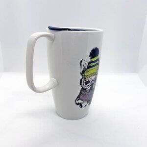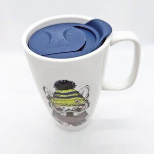 Coco & Lola ceramic travel mug with lid, featuring an adorable French Bulldog wearing a scarf, ski goggles and hat.Like new.
