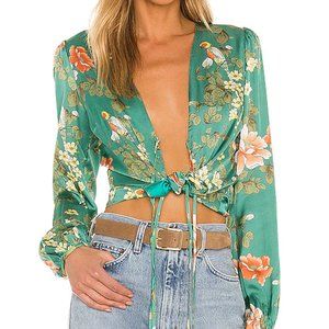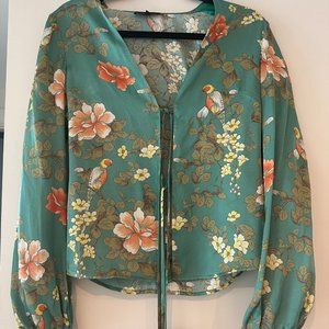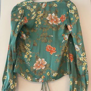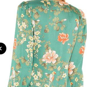 Self: 55% viscose, 45% rayon.Lining: 97% poly, 3% spandex. Hand wash cold. Split front with tie closures. Button cuffs. Satin fabric.