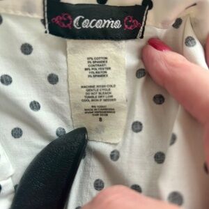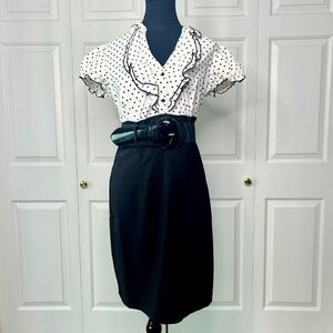 This Cocomo polka dot shirt top and black skirt dress, size 8, with patent black belt. This polka dot bodice has feminine ruffles. The black skirt lands around the knee. The patent belt cinches the waist and creates an hourglass shape. This dress is perfect for work or going out.