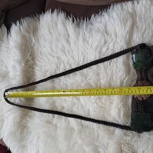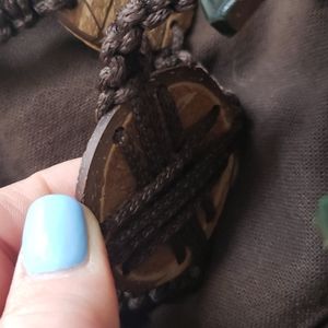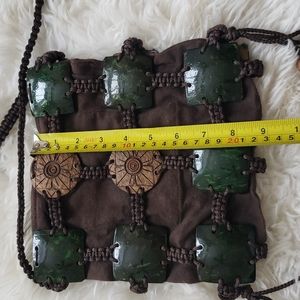 Super cute boho crossbody purse made with what appears to be coconut shells, macrame, and wood. zip top, small internal pocket. Such a unique piece! Unbranded.