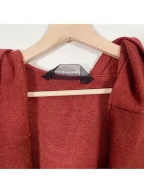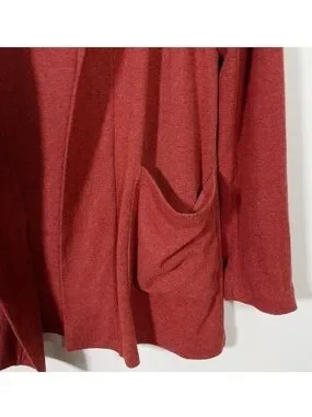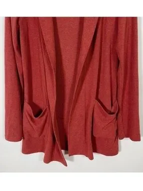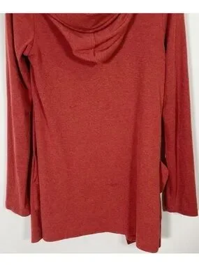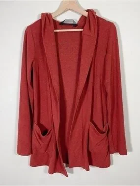 Soft open-front cardigan in a warm rust hue. Lightweight knit designed for layering and everyday wear. Features long sleeves, hood and two front pockets for convenience. Easy-care fabric with a relaxed, flattering silhouette. Size medium.