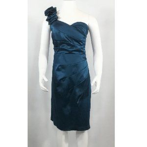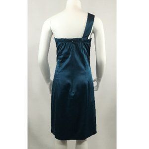 Dark teal satin one-shoulder dress. Sweetheart neckline, knee-length. Back zip. Decorative fabric on shoulder strap, sunburst seaming on body. Light padding in bodice front, elastic at bodice back. Fits small, not like a medium at all.