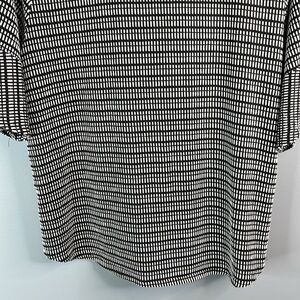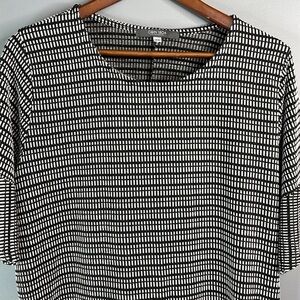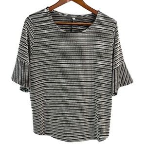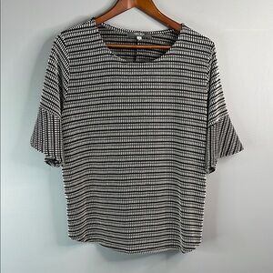 Women’s black and white Coin 1804 Los Angeles Ruffle Sleeve Pattern Knit Top - polyester, rayon and spandex stretch blend.