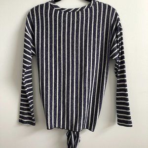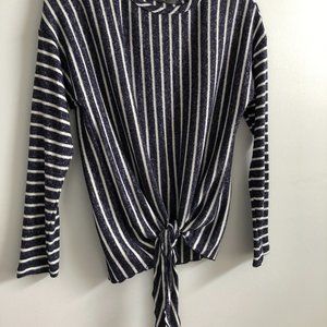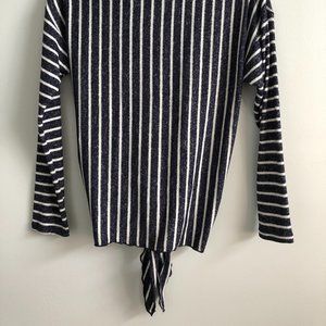 Cute sweater by Coin 1804 with vertical navy and white stripes. Features a tie-front and contrasting neck trim and drop shoulder.