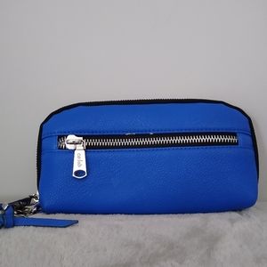 CO-LAB at Simons royal blue grained wristlet. A minimalist design that's large enough to carry your essentials wherever you go. Zip closure. Multiple slits and pockets for cards, coins and bills. Exterior has a zipper pocket. Good condition, 9/10. Small amount of peeling inside and outside. Small mark in interior pocket as shown in pictures.