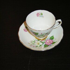 Cup and saucer in pattern 7926, a pink, white, blue floral display with gold banding on the edges