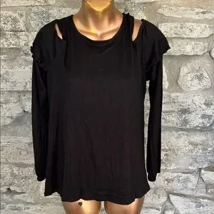 Stylish black long sleeve top with unique cut-out details. Ruffle shoulder. Waffle/crinkle material.