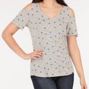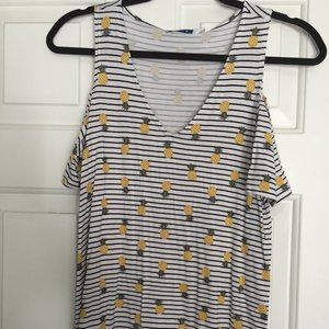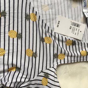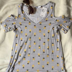 NWT Cold Shoulder Tshirt with pineapples and stripes from Rickis - retails $26.90. Size XS. NWT cosemetics bag (not Rickis) with pineapples and stripes. Super cute set that makes a great gift for someone, or for yourself!
