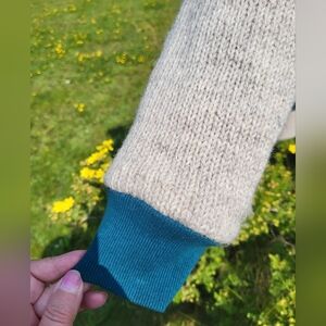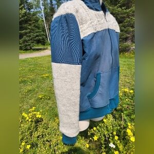 True to size large, unisex, nice teal blue cotton, very stylish! Canadian designer, manufactured in Kathmandu.