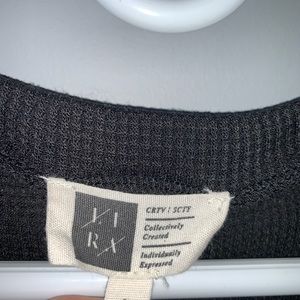 Comfortable black cold shoulder top. Comfortable waffle-knit cotton relaxed fit. Hangs generously around the hips.