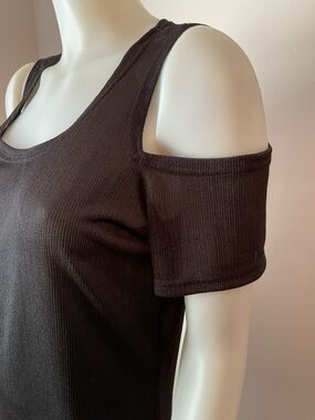 Stylish black cold-shoulder dress with a relaxed, straight silhouette. Modern cutouts at the shoulders for a trendy look. Subtle texture Stretch fabric Pit to pit 20 inches, length 42 inches