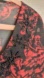 Gorgeous sheer red and black waterfall sleeve blouse featuring an intricate abstract paisley print and beaded neckline.