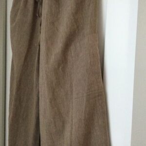 Lovely, wide leg capris in excellent condition. Very comfortable capris, drawstring waist with elasticized waist at back. Two deep side pockets, one pocket on on pant leg. Lovely mocha color, 57% Linen, 43% rayon. Leg length from waist is 36”, and inside leg is 24”. Very quiet lux look, and the ultimate summer Capri for comfort and style.