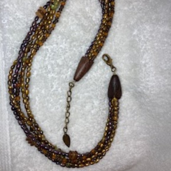 Authentic Coldwater Creek multi-coloured (gold, green, purple) beaded necklace can be worn just hanging loose, or twist for a different look. Necklace extends approximately 18" inches. Chain link extender is 2" inches long, along with a Coldwater Creek leaf charm. Large claw closure, with dark brown wooden accents at the top of each side of the necklace.
