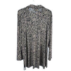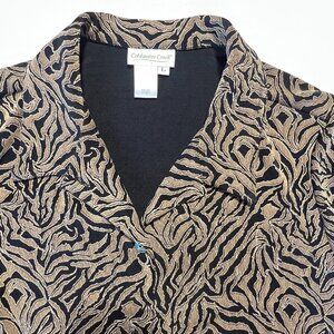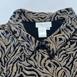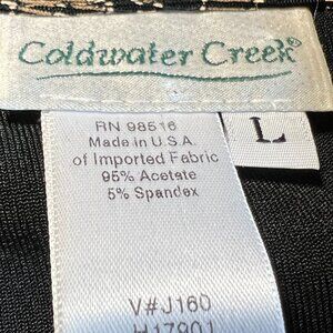 Features a bold black-and-beige abstract print, acetate/spandex blend, and a flattering silhouette perfect for dressy casual looks. Whether you're curating a vintage wardrobe or just love unique finds, this top delivers effortless elegance with retro charm. Vintage Coldwater Creek, Y2K fashion, early 2000s top, abstract print blouse, made in USA, retro style, acetate spandex, timeless fashion, classic Coldwater Creek, size L women’s top