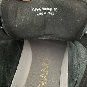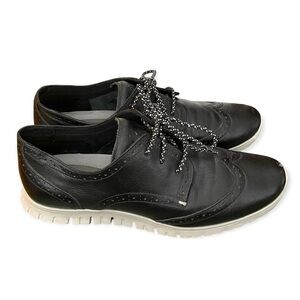 Elegant black leather with a white sole. Features perforated detailing. Classic lace-up design.
