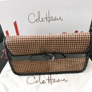 Original box and Dust Bag Has an integrated strap which is in the inside of the clutch flap which is held in place with snaps. Belt detail on back. Built in mirror and one zipped pocket. Brand plate inside reads Cole Haan Collection. Size is 9.75 inches wide x 5.5 inches high and 2.5 inches thick.Includes dust bag.
