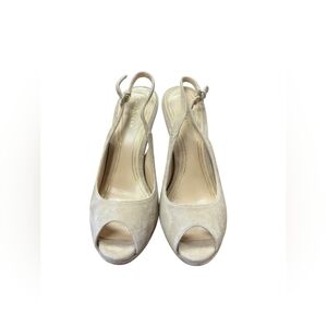 Cole Haan tan slingback peep-toe heels. Gold buckle, nude sandstone suede, stacked heel with metallic gold detail.