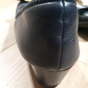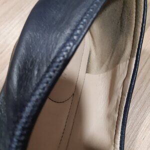 Chic dark blue loafers. Adorned with a gold accent. Ideal for versatile wear.