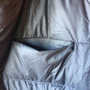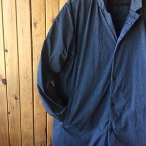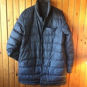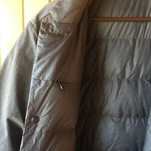 Cole Haan Zerogrand duck down coat is reversible and water resistant. Lightweight. Wear with smooth side out for more business like look or switch it up to side with channels for casual look. Pockets both ways with extra chest zip pocket on casual side. Please note this is missing top snap.