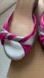 Chic fuchsia and silver heels with elegant straps. Perfect for a stylish look.