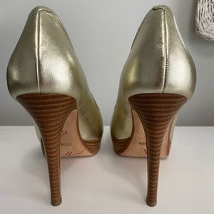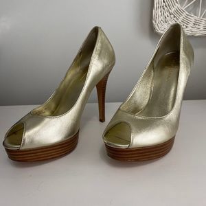 Elegant gold peep toe heels. Features a sleek design with a wooden platform.