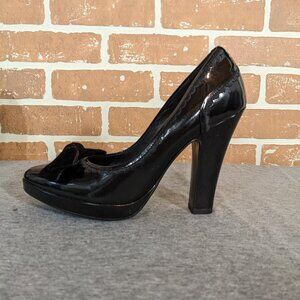 Very good condition. Black patent heels with velvet bows on the toes. Platform sole is 1/2". 3 3/4" heels.