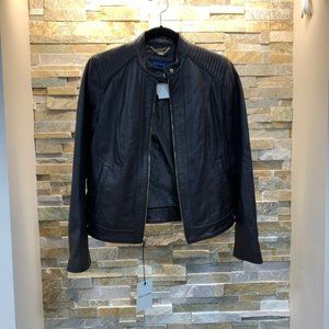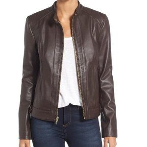 A band collar, quilted shoulders and golden hardware bring an air of sleek sophistication to this racer-inspired moto jacket crafted from glossy lambskin leather.