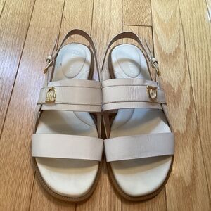 Cole Haan sandals. White leather, size 7. Gold hardware. Minimal heel (under 0.25 inches). Comfy padded sole. Buckle closure.