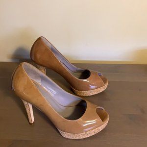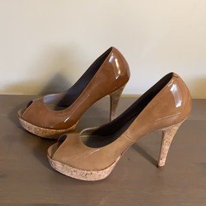 EUC Cole Haan “Mariela” tan patent leather peep-toe stiletto pumps with Nike Air soles in women’s size 6.