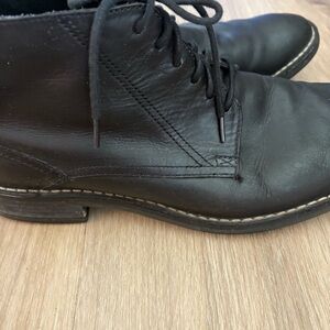 Step into timeless style with these Cole Haan men’s black leather chukka boots, size 13M. Crafted from smooth genuine leather, these boots feature classic lace-up styling, cushioned insoles, and durable rubber outsoles with traction grip. The versatile design makes them perfect for both business casual wear and everyday styling.