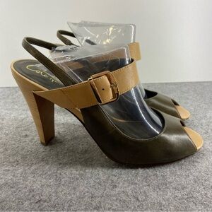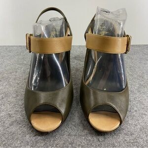 Stylish olive and tan heels. Peep-toe design. Adjustable buckle strap. Perfect for any occasion.