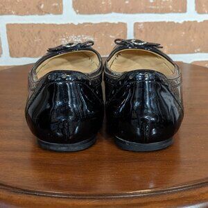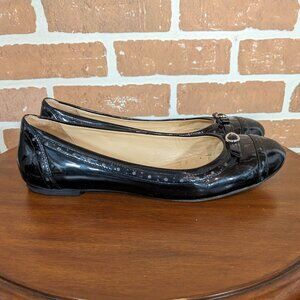 Very good used condition. Black patent flats in spectator style. Silver tone buckles.