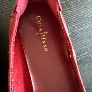 These Cole Haan flats feature a vibrant red color with a glossy finish, complemented by a small decorative gold buckle. Designed with a rounded toe and flat sole, they offer a classic silhouette perfect for versatile styling.