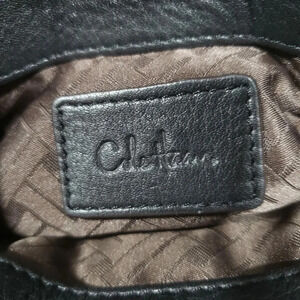 Cole Haan womans black mini leather clutch/makeup pouch with front buckle and double magnetic closure.
