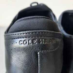 Laser cut wingtip upper pattern in smooth leather. Fully rubber outsole with Grand OS tech. Shoes are black and in great condition. Minor wear, the rubber Zeorogrand logo on the tongue has come off in spots (see pics), this is not noticeable when the shoes are on.