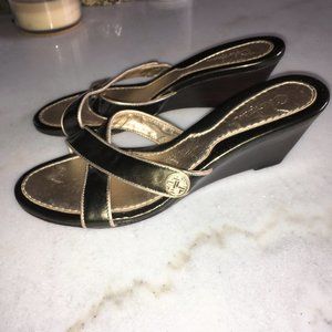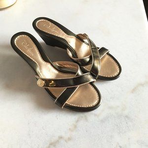 Cole Haan mule wedge sandals, olive green & gold, patent leather X cross