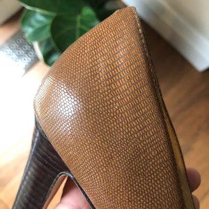 Classic Cole Haan tan embossed leather pumps with a peep toe cut out. Natural leather stacked heel. Gently warn. small nick out of front edge on left foot, as show in photos.