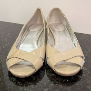 Cole Haan Women’s Tan Patent Melina Criss Cross Open Toe Cork Wedge . Size 8B. Some marks - no tears