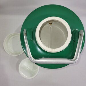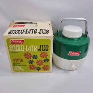 Coleman vintage 5501D green water jug cooler. In very good used shape with original box as shown. Includes original cap and cup that fits inside.